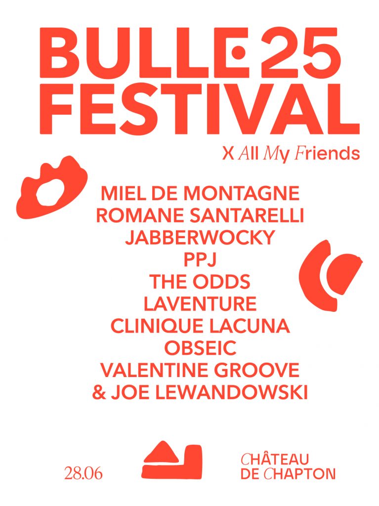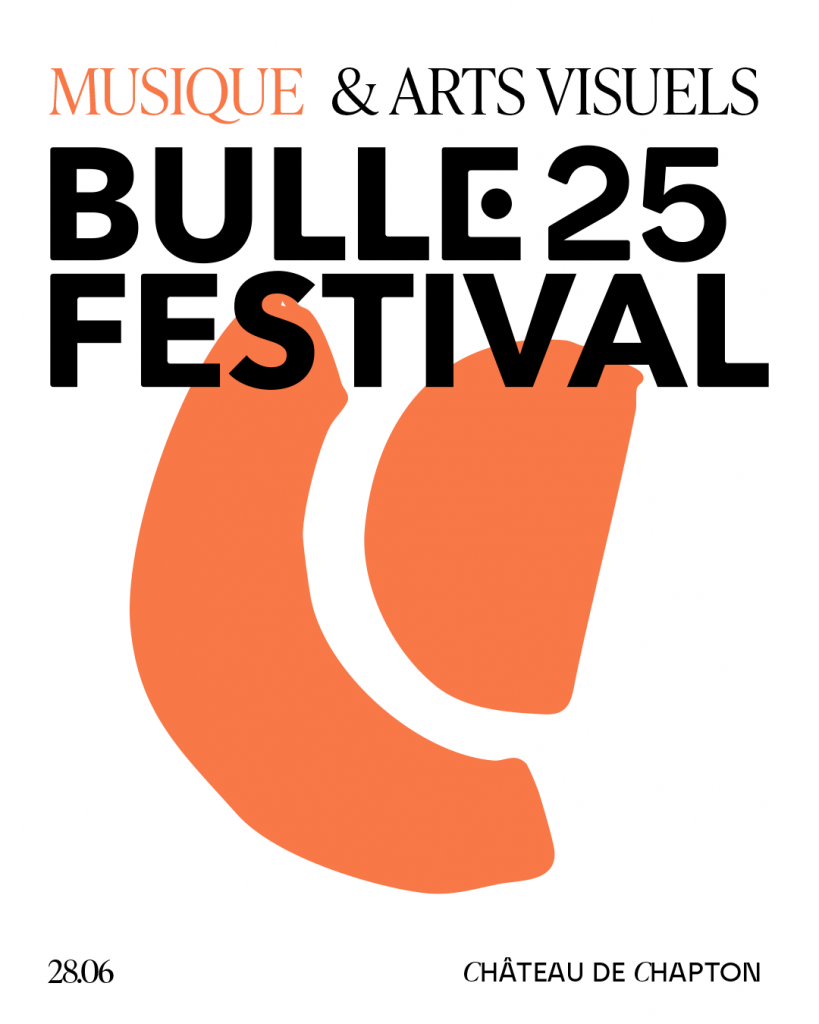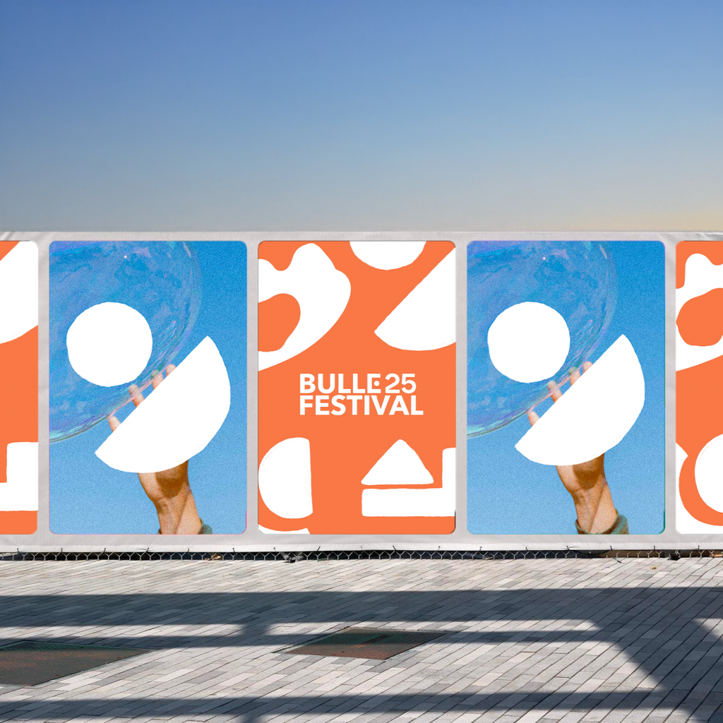 L’univers visuel de Bulle 25 se caractérise par des formes organiques et modulaires, venant compléter une composition typographique issue d’une fusion entre linéale et sérif. Ces formes, plutôt abstraites, symbolisent les différentes spécialités du festival : le château, la musique (inspirée de la forme d’une oreille) et les arts visuels (inspirée de l’œil). D’autres pictogrammes et éléments de signalétique seront développés dans la continuité de cette identité.